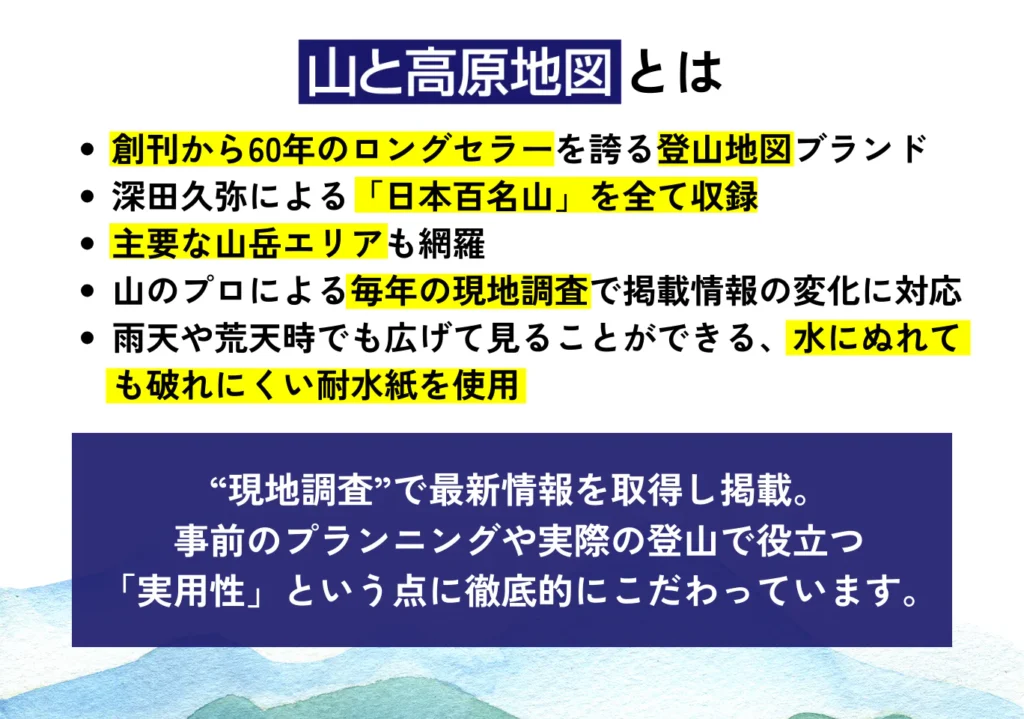 登山者に支持されている理由は、各エリアに精通した著者が実際に山を歩き、その現地調査によって得られた情報を地図に落とし込んでいるから。毎年更新される情報の新鮮さ、山のプロフェッショナルである著者の視点、そして昭文社ならではの地図表現の見やすさによって「登山者必携の地図」と定評いただく信頼の地図ブランドです。