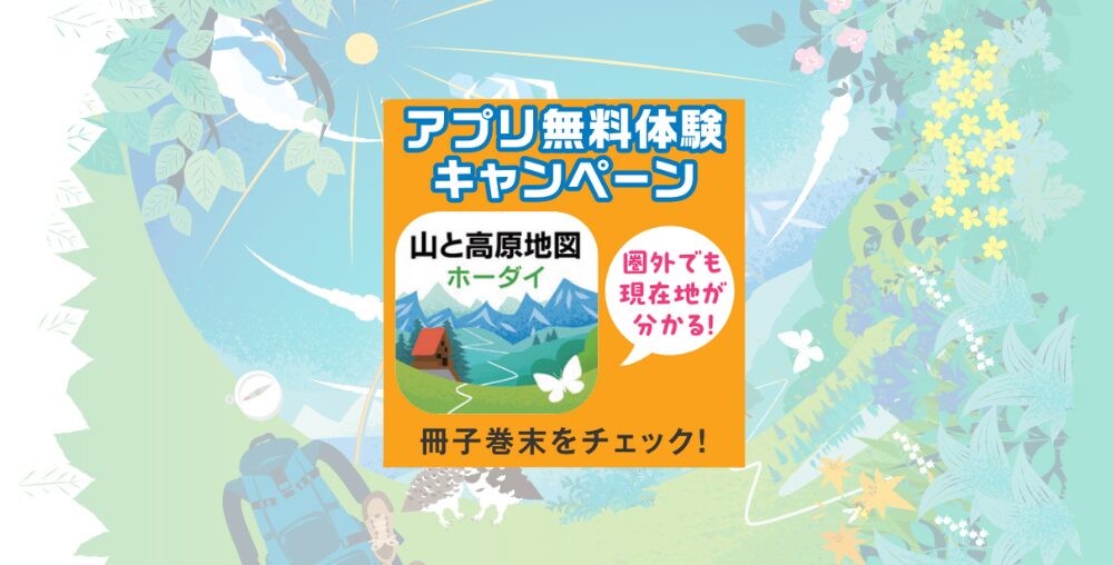 山と高原地図はスマートフォン用アプリ「山と高原地図ホーダイ」をリリースしています。アプリでは登山地図を閲覧できるだけでなく、地図上で現在地を確認したり、歩行ルートの記録と共有、行程表の作成など便利な機能が満載です。