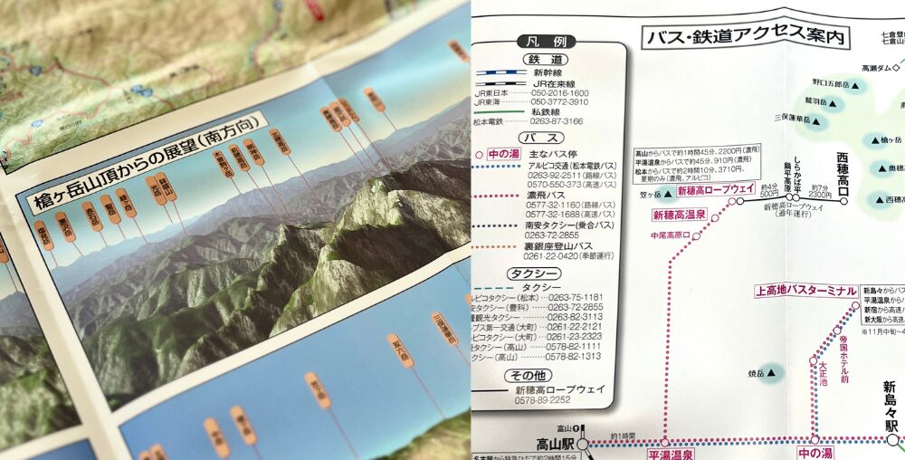 山域全体の地図だけでなく、分岐や複雑な登山ルートは拡大図やイラストで詳しく解説。道迷いの危険が高いポイントも分かりやすく表示しています。山頂からの眺望イメージ図や現地までの交通アクセスなど、登山者にうれしい情報も記載されています。