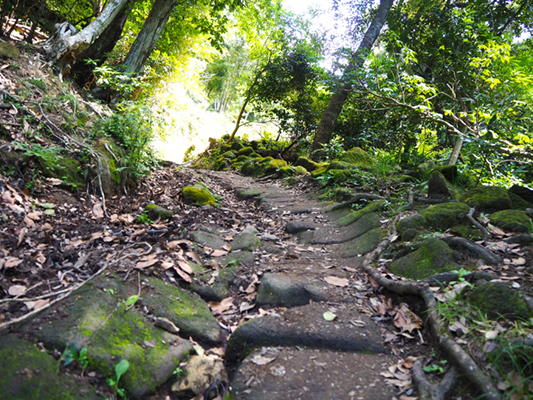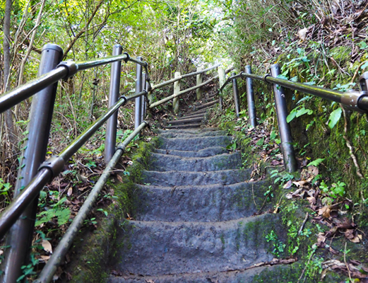 苔むした石畳には荷車の轍が今も刻まれており、当時の人々の往来を偲ばせます。女性たちが荷車を押しながら急坂を登り下りしたという歴史を思い浮かべながら歩くと、ただの登山道以上の味わい深さを感じられるはずです。周囲の木立に包まれ、少しずつ日常から切り離されていく感覚を味わいながら、鋸山登山の物語がここから始まります。