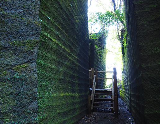 歴史ある車力道を抜けると、目の前に鋸山を象徴する石切り場跡が現れます。垂直に削り取られた巨大な岩壁がそびえ立ち、光と影が織りなす景観はまるで古代遺跡のよう。入り組んだ切通しの奥へ進むと、迷宮に迷い込んだかのような不思議な感覚に包まれます。