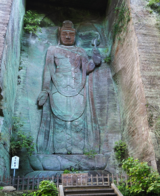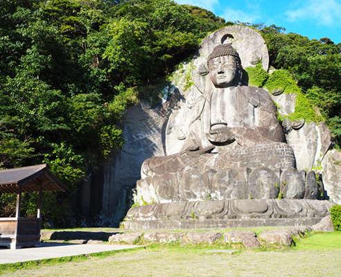 日本寺の境内をさらに進むと、高さ31mを誇る日本寺大仏(薬師瑠璃光如来)が姿を現します。岩肌に刻まれた日本最大級の摩崖仏は圧倒的な存在感を放ち、静かに佇む姿はまさに荘厳そのもの。長い歴史の中で多くの参拝者を迎えてきた大仏の前に立つと、自然と心が落ち着いていくのを感じられます。