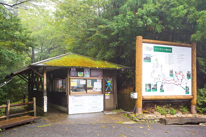トレッキングは管理棟からスタート。屋久島の山岳エリアでは、自然保全を目的とした協力金制度があります。ここで協力金(500円)を支払い、ルートマップを受け取ります。トイレは向かいの売店「森泉」にあるので、必ずここで済ませておきましょう。出発前の準備が整ったら、いよいよ屋久杉の森へ。
