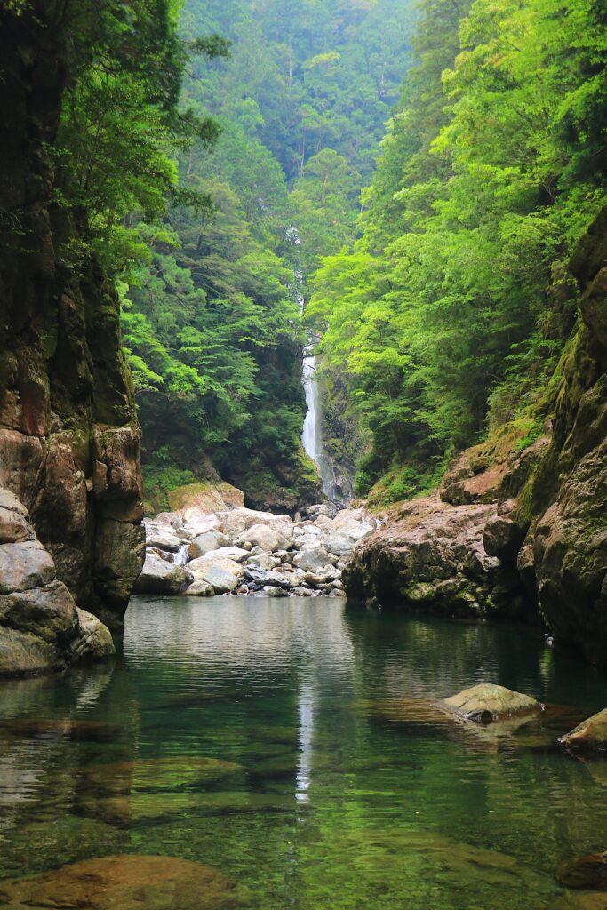 片道約16kmの登山道は、七ツ釜滝をはじめとする名瀑を眺めながら進むスリリングなルート。初級者向けではなく、中級者〜上級者向けの内容ですが、原生林と断崖、渓谷美が織りなす絶景の連続は、登山愛好家の心を掴んでやみません。