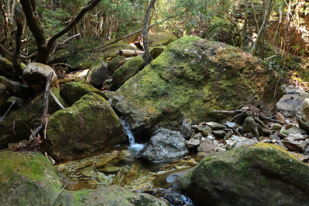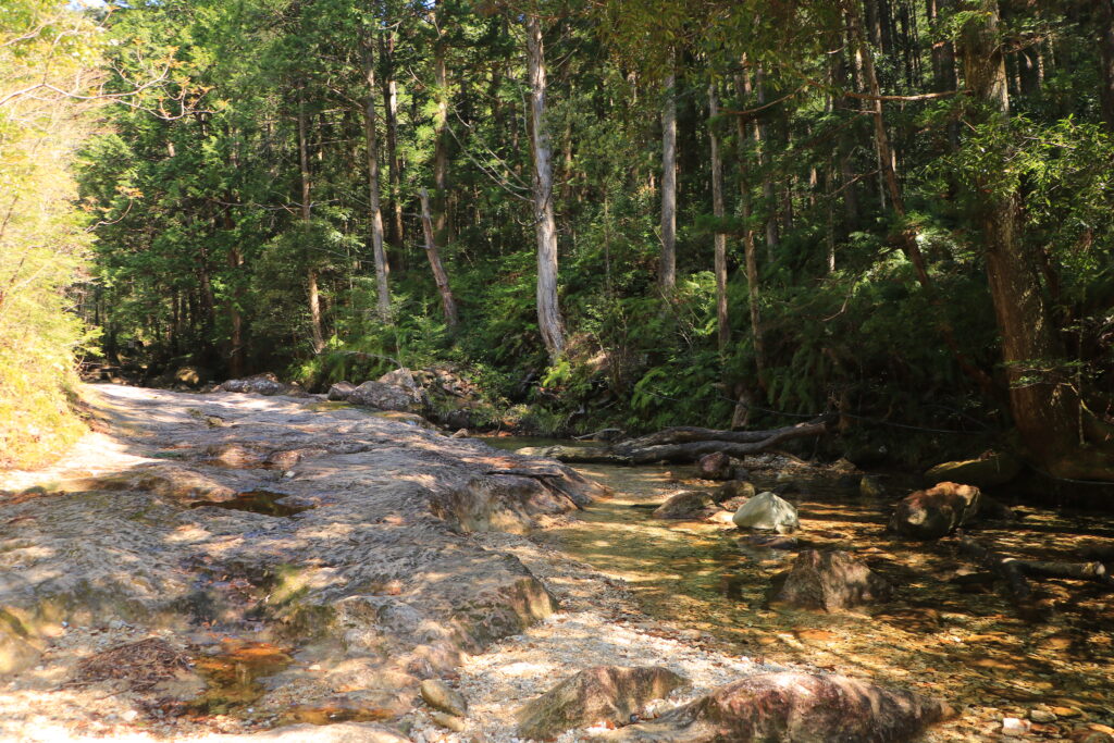 やがて視界が開け、沢沿いの平坦地に到着。小休止に適したポイントで、登山道で唯一の渡渉地点を越えて進みます。水量が多い時期は足元に注意が必要です。