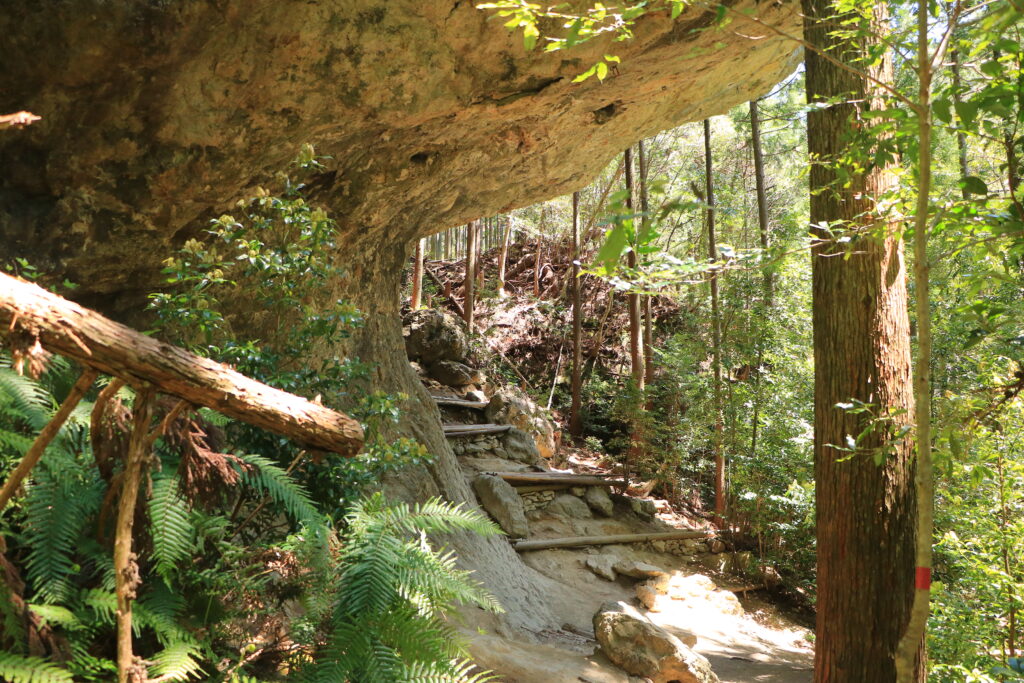 乳岩を過ぎると道は次第に傾斜を増し、本格的な登山道らしい雰囲気に変わっていきます。峡谷を離れて杉林の中を進むと、静寂に包まれた空間で森林浴を楽しみながら歩くことができます。