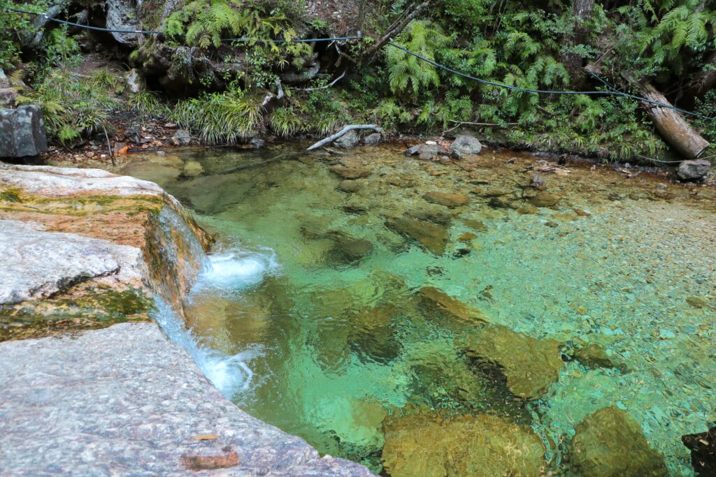 まず現れるのは大きなエメラルドグリーンの淵。川の流れがつくった天然のテラス状の岩盤で、渓谷入口のシンボル的存在です。水面に光が差し込むと、幻想的な景観が広がります。