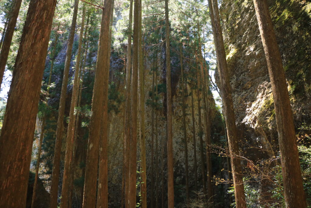 この先で現れるのが、フリークライマーにも知られる「鬼岩」。切り立った大岩壁が目の前に立ちはだかり、その迫力に思わず足を止めてしまうほどです。
