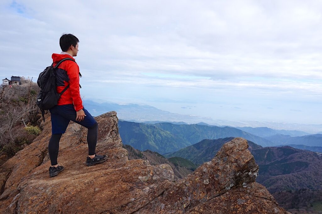 弥山から天狗岳へは細い尾根をたどるスリリングな道が続きます。山頂に立てば、瀬戸内海から四国山地までを一望でき、西日本屈指の360度の大パノラマが広がります。