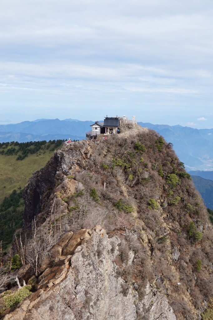 鎖場を選んだ場合、二の鎖小屋を過ぎて二の鎖に挑み、そのまま三の鎖を登り切ると、標高1,974mの弥山に到着。山頂には石鎚神社頂上社が鎮座しています。巻道を通れば淡々と階段が続きますが、途中に広がる景色は絶景で、歩みを進める力を与えてくれるでしょう。