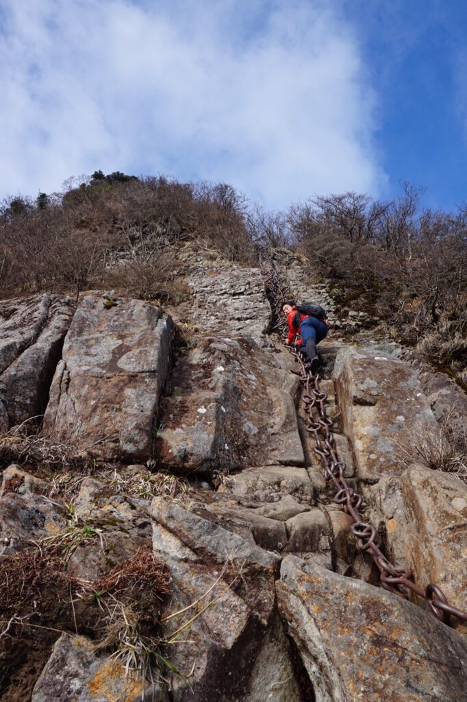 途中には「試しの鎖」「一の鎖」「二の鎖」「三の鎖」といった行場があり、技量に応じて鎖場か巻道(難所を避けるための迂回路)を選べるのも魅力のひとつ。