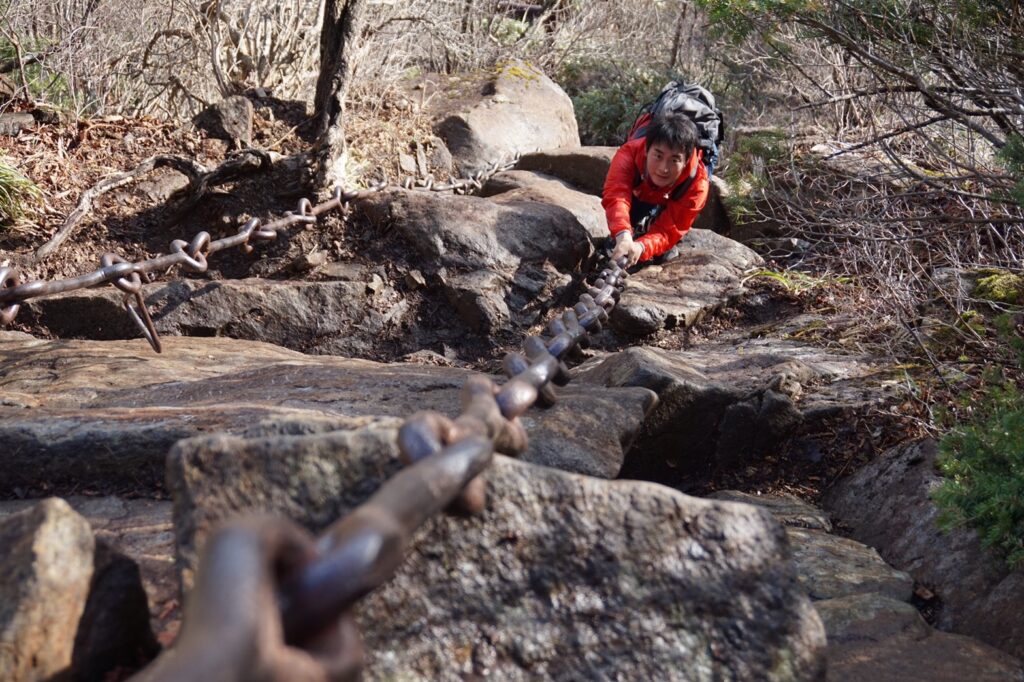 問題なく登れるようであれば、その先の「一の鎖」(約33m)や「二の鎖」(約65m)に挑戦可能です。そして最大の難関が「三の鎖」。全長約68m、高度差70m近い岩壁を登るもので、まさに修験道の厳しさを体感できるコースです。