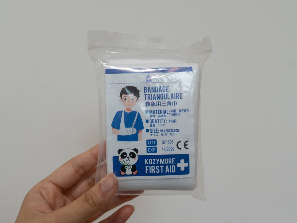止血や固定、保護など幅広く使える万能アイテムです。テーピングや包帯より丈夫で、状況に応じて腕の固定や頭部の保護にも活用できます。キットに1枚は常備しましょう。