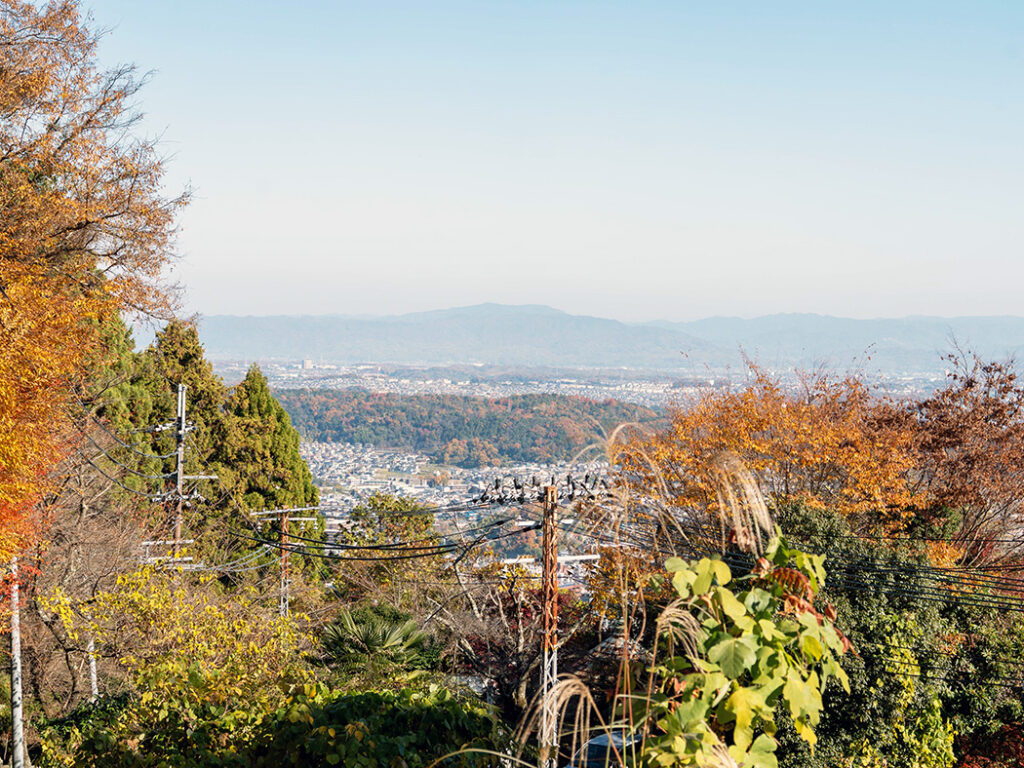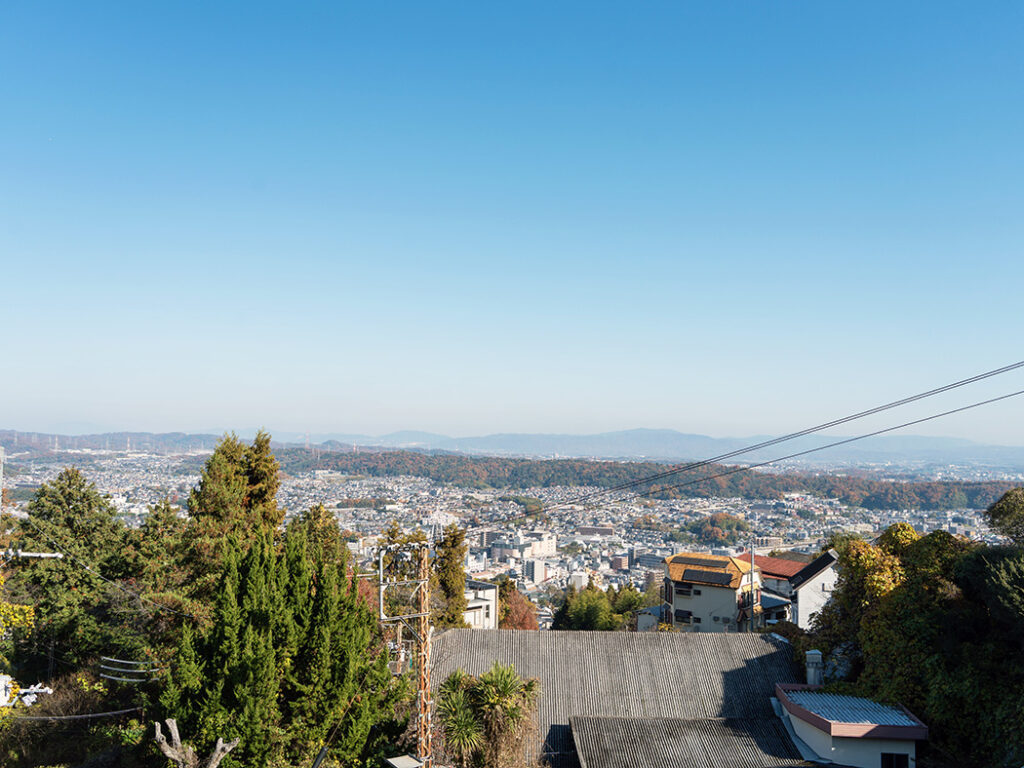 周囲に目をやると、遠くの山や住宅街が見えます。かなり高くまで登ってきたことがわかりますね。