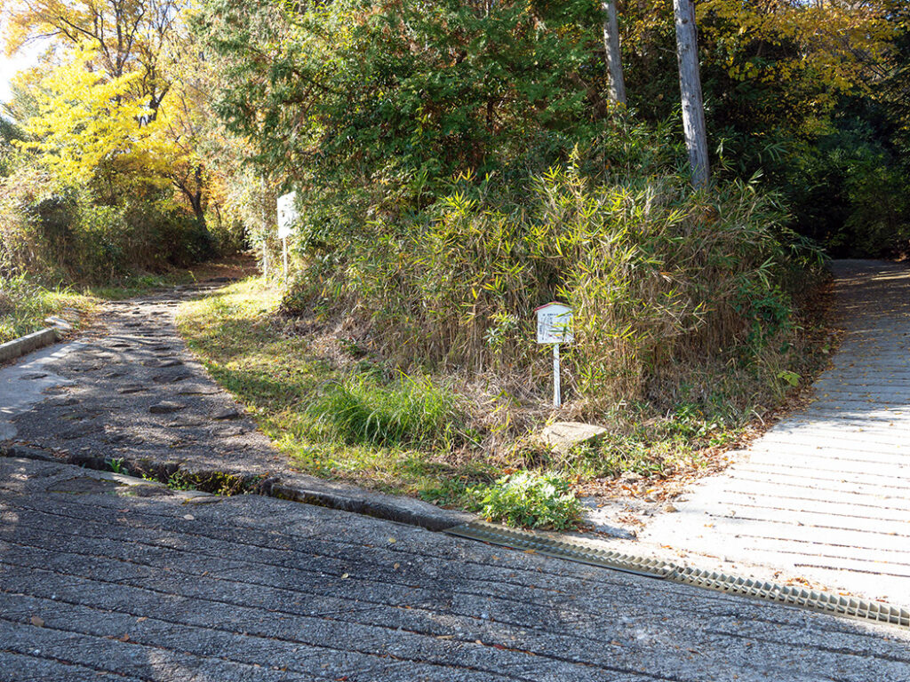 道が二手に分かれ、小さな案内板が立っていました。「登山道」と書かれた案内に従い、左側のケーブルカー沿いの道へと進みます。