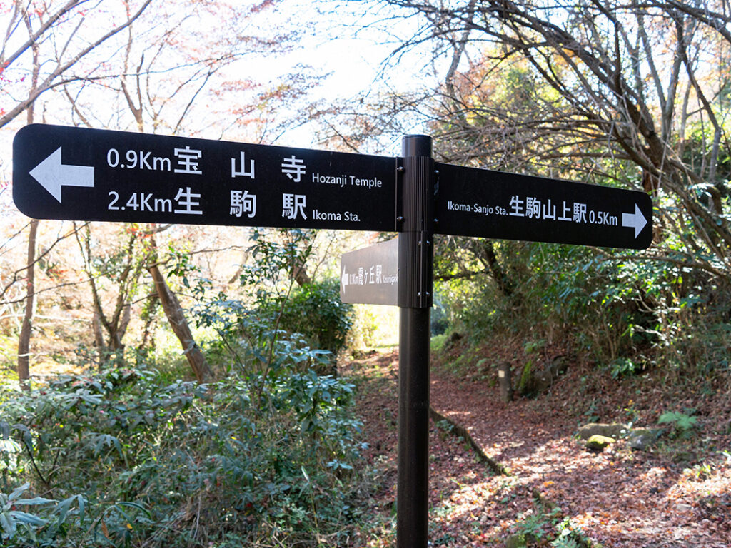 分岐点に到着。左へ進むとケーブルカーの霞ヶ丘駅があります。「生駒山上駅→」の道標に従い正面の道へ。