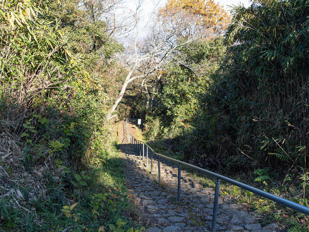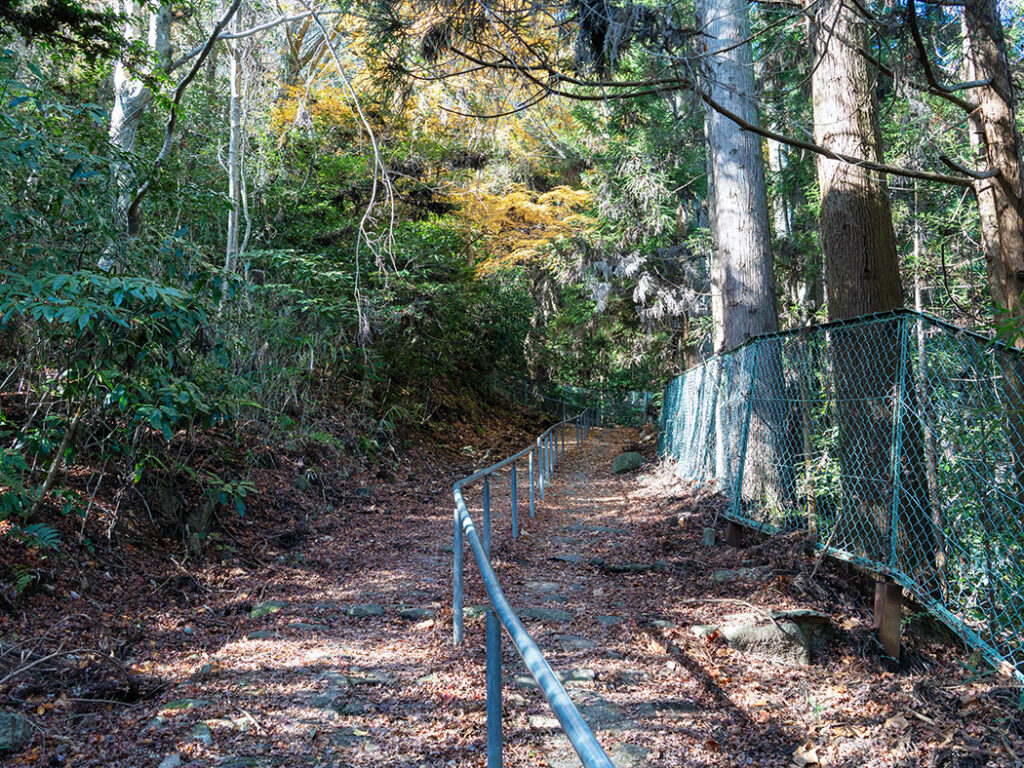 石畳やコンクリートで舗装された登山道は緩やかで、ハイキングの感覚で歩けます。道中は階段が多く足やひざへの負担がありますが、手すりや休憩所があり、体力に自信がない方でも無理なく登れるでしょう。