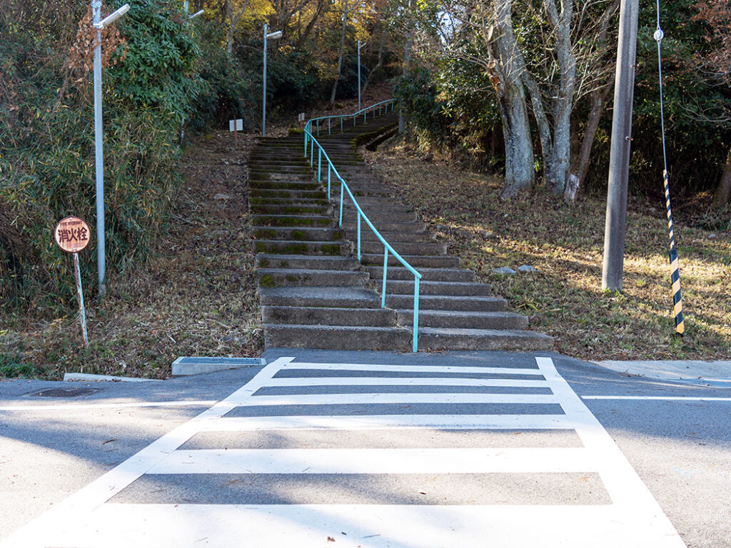 登りきると道路があり、左右には生駒山上遊園地の駐車場が見えます。山頂まで残り200m。階段が続いて少し大変ですが、ラストスパートをかけて進みましょう。