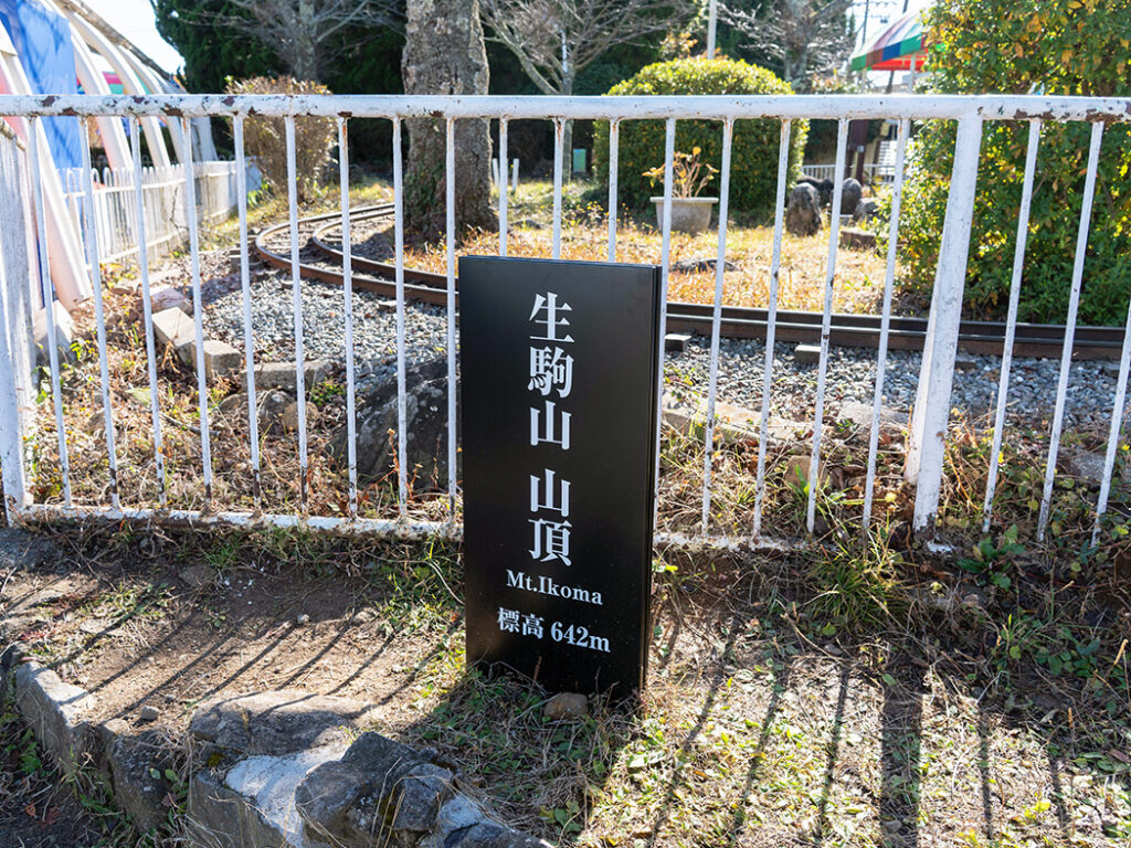 生駒山の山頂看板は、ベンチがたくさん設置されている休憩所のすぐ隣と、SL列車のアトラクション内にあります。