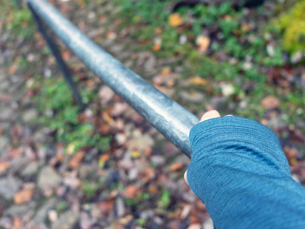 足だけに負担をかけるのではなく、手すりを利用して下るのがおすすめです。