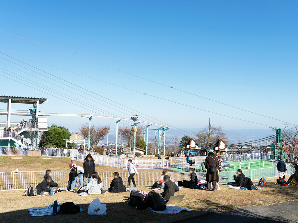 山頂エリア一帯は、生駒山上遊園地の敷地内。展望デッキやアトラクションからは、西に大阪平野と六甲山系、東に奈良盆地と大和青垣の山々が一望できます。都市と自然が一体となった、関西を代表する絶景のひとつです。