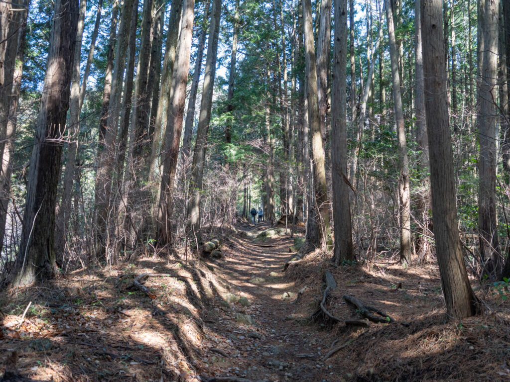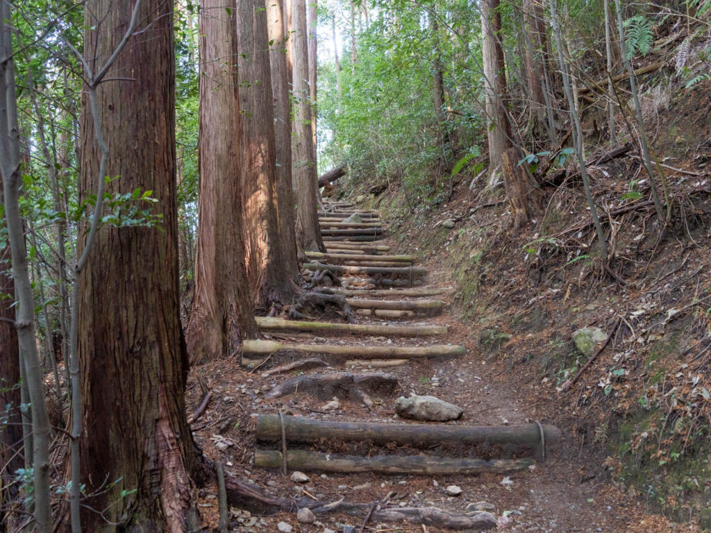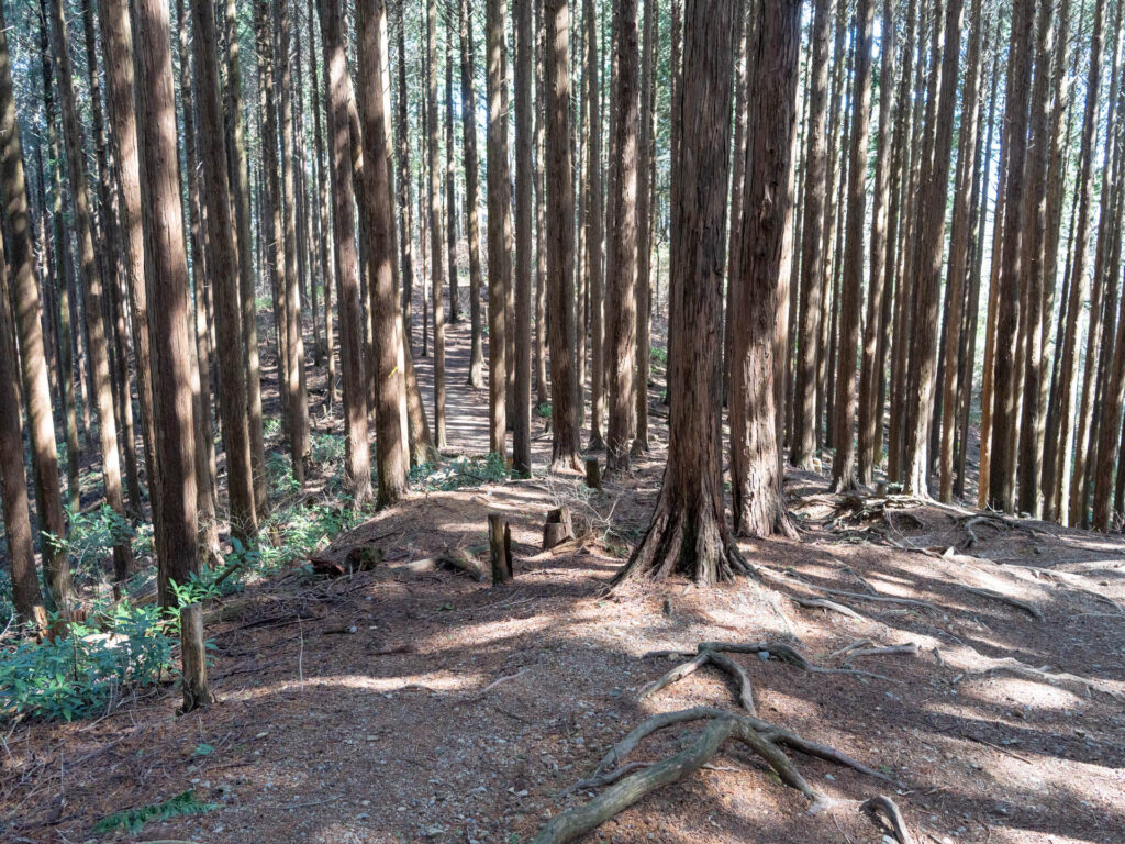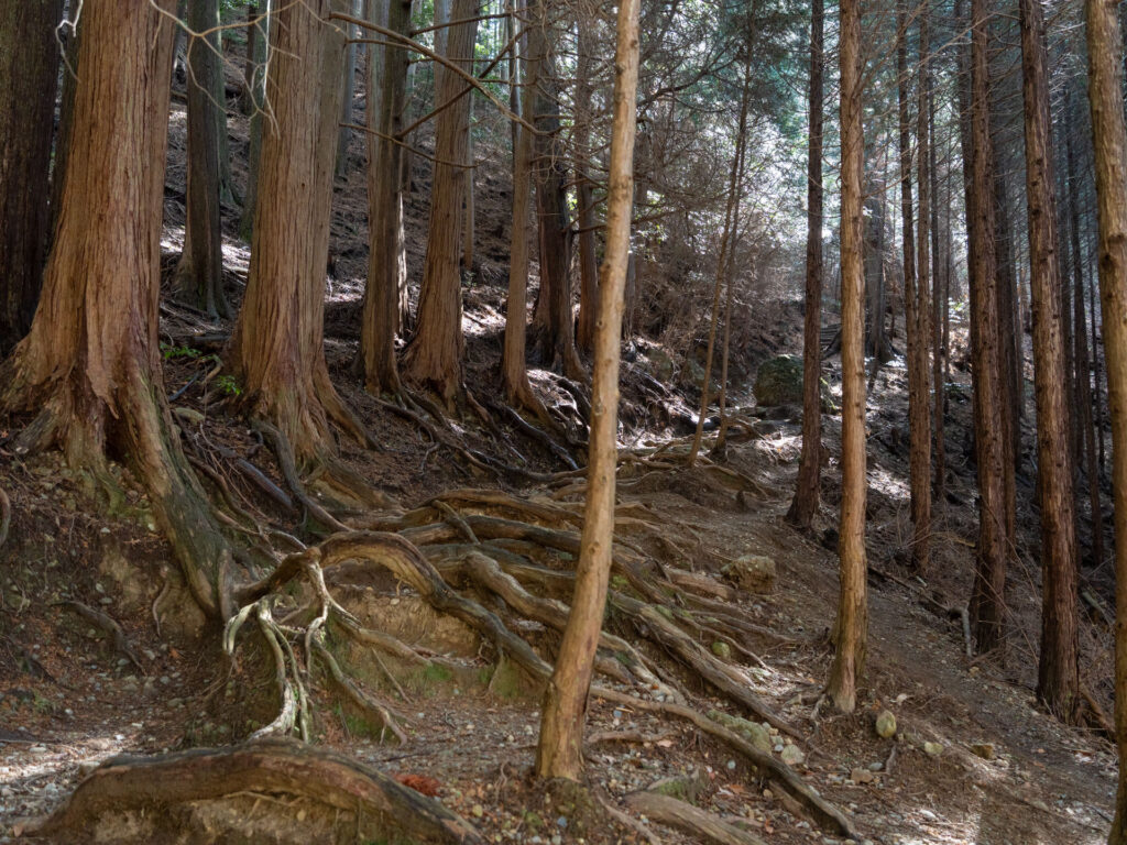 真っすぐ伸びる木々の隙間を抜けていきます。傾斜はややきつく、足元には大きな木の根が張っています。この先には幅の狭い階段も現れるため、ここは一歩ずつ慎重に。