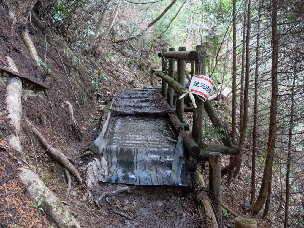 緑豊かな大自然を満喫しながら歩いていると、丸太で作られた小さな橋が現れました。次々と移り変わる景観が楽しめるのは、岩湧山登山の魅力のひとつです。