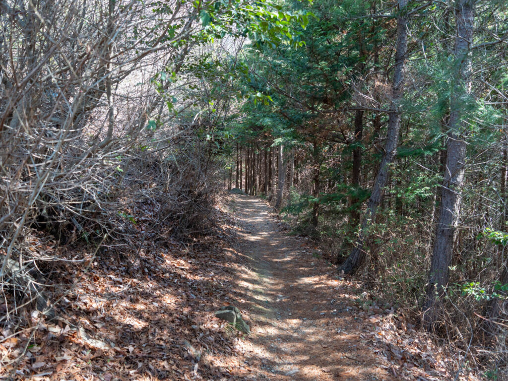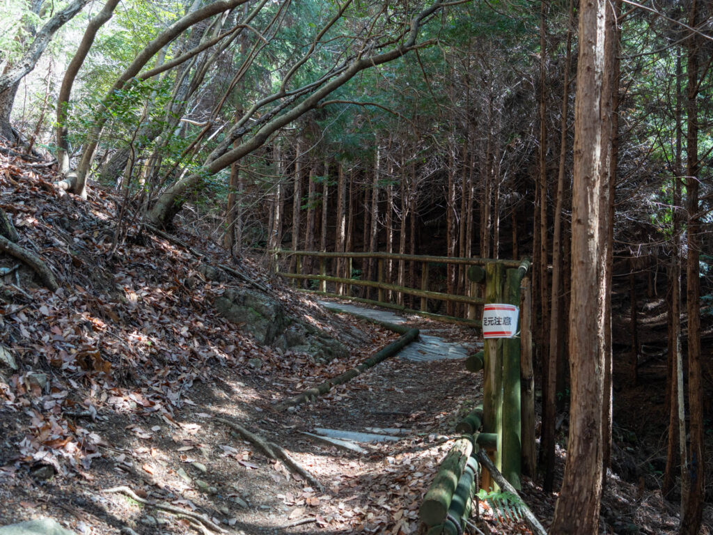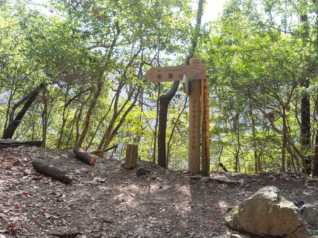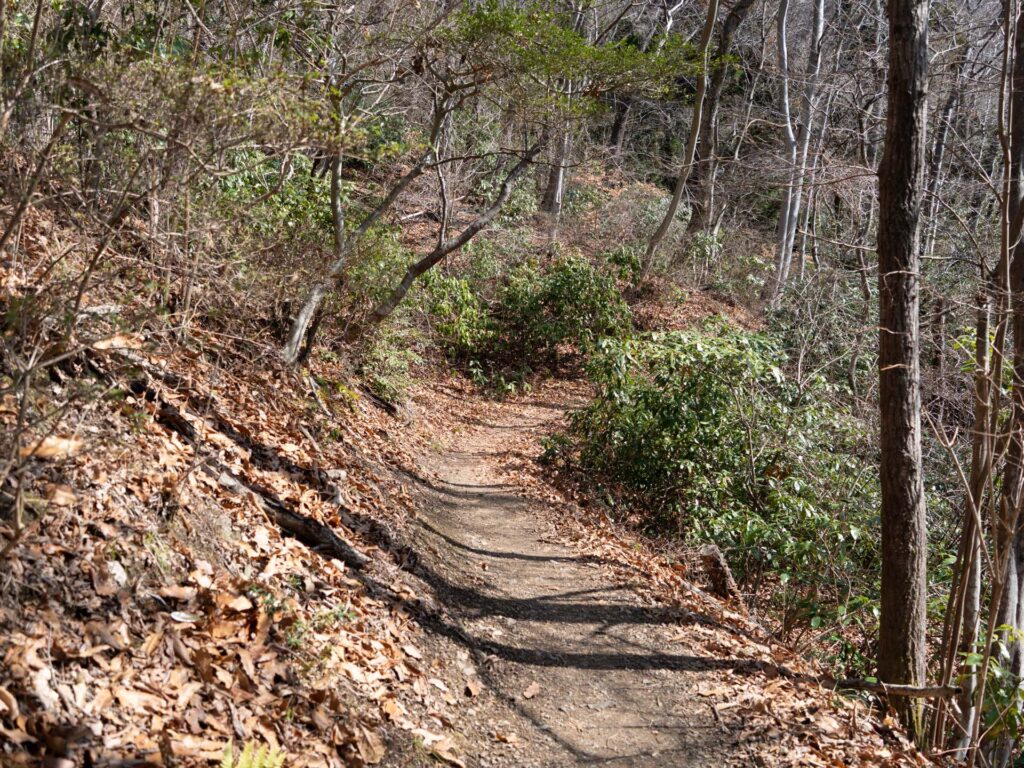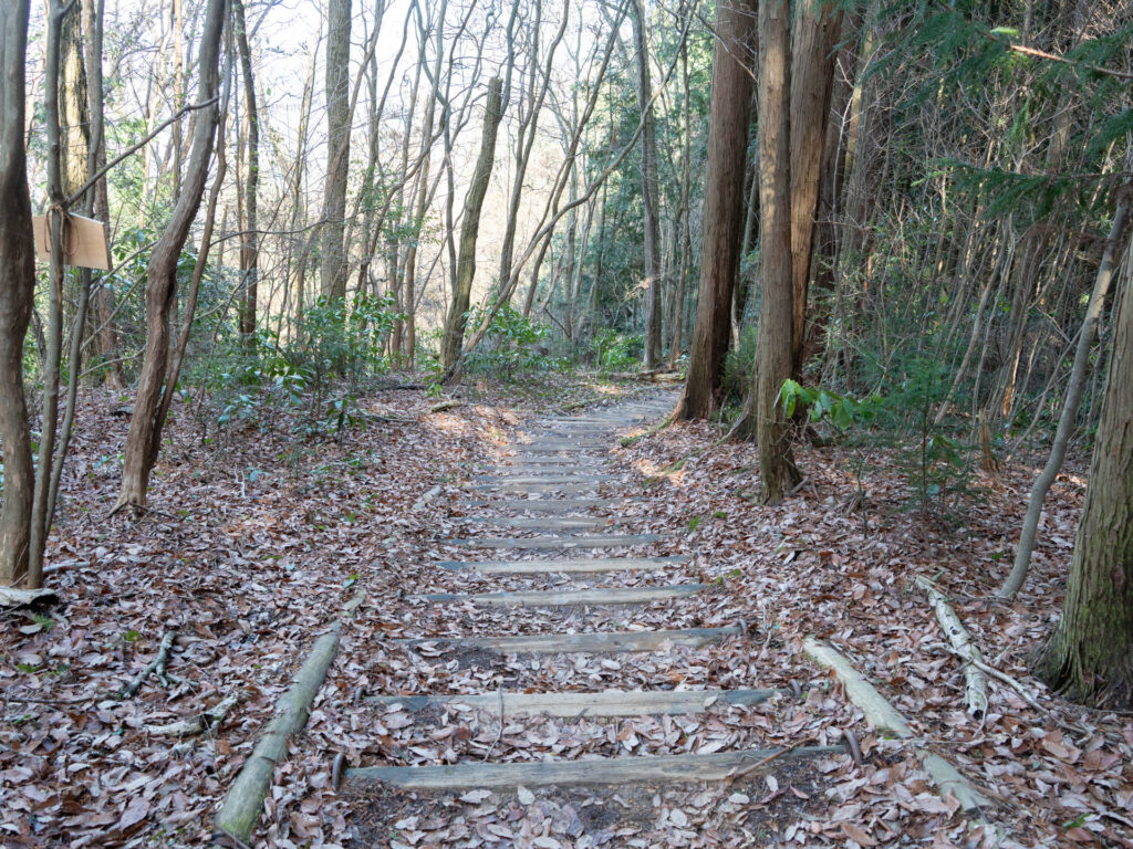最初は右下に道路を見ながら、狭い登山道を進んでいきます。ダイヤモンドトレールの一部でもある登山道は、道標や階段が頻繁に現れ、歩きやすく整備されている印象です。