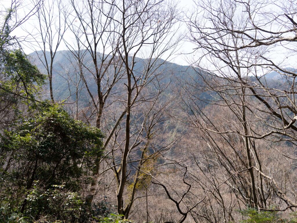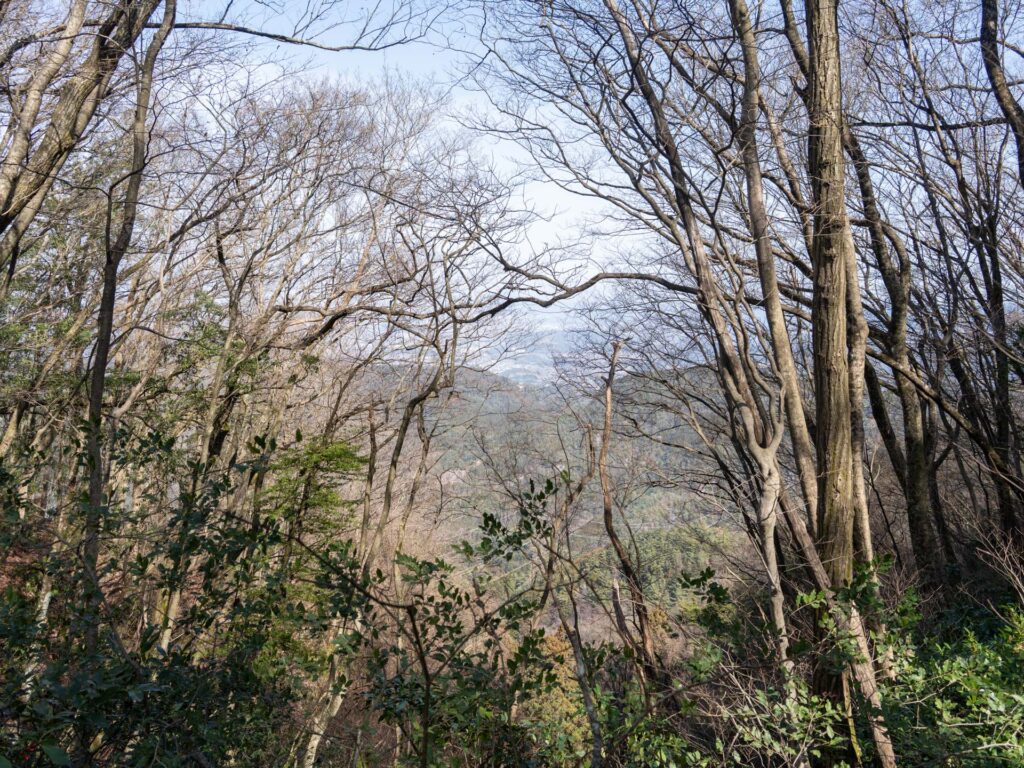 木々の間から、遠くの山やその向こう側の街がうっすらと見え、高い所まで登ってきたことが分かります。標高が上がりやや寒さを感じたため、ここでアウターを羽織りました。