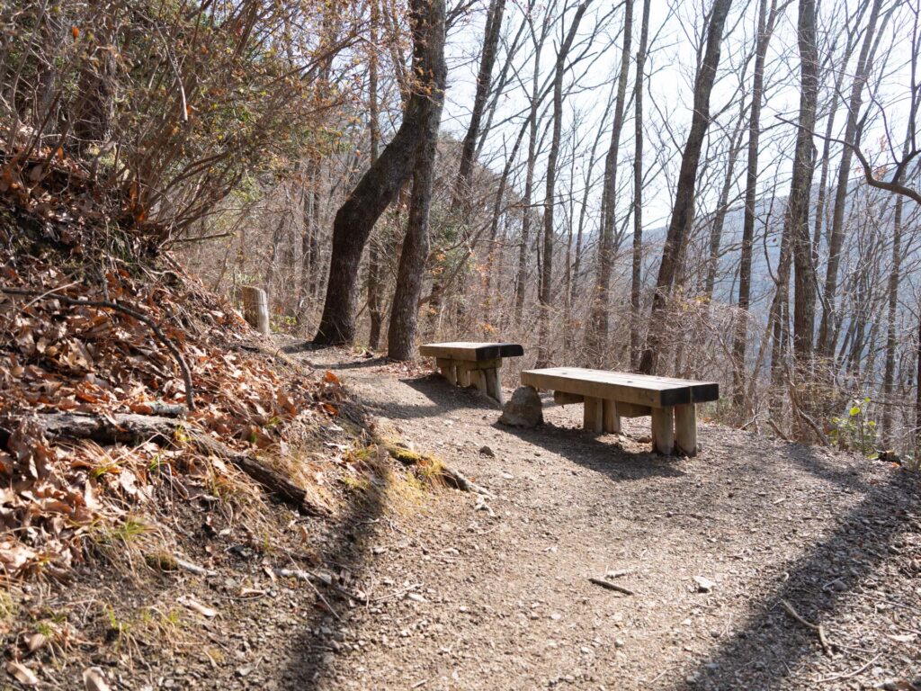 トイレから少し登ると、中継地点「東峰」に到着です。山頂からおよそ5分でベンチも設置されているので、山頂が混雑しているときはここで休憩するのもおすすめです。
