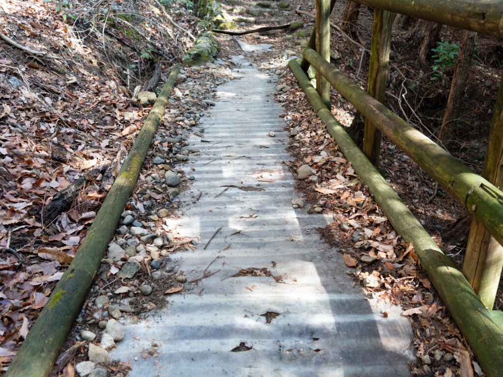 しばらく階段を下ります。緩やかな道が続いたため、久しぶりの下りで少し足が震えました。気を抜くと滑りそうになるため、慎重に進みます。