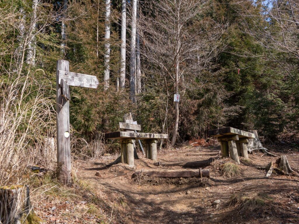 樹林帯を抜けると、ベンチと道標が置かれた分岐点に到着します。左へ向かうと「扇山(おうぎやま・標高763m)」の山頂がありますが、今回は岩湧山の山頂に向かうため正面の道へ。