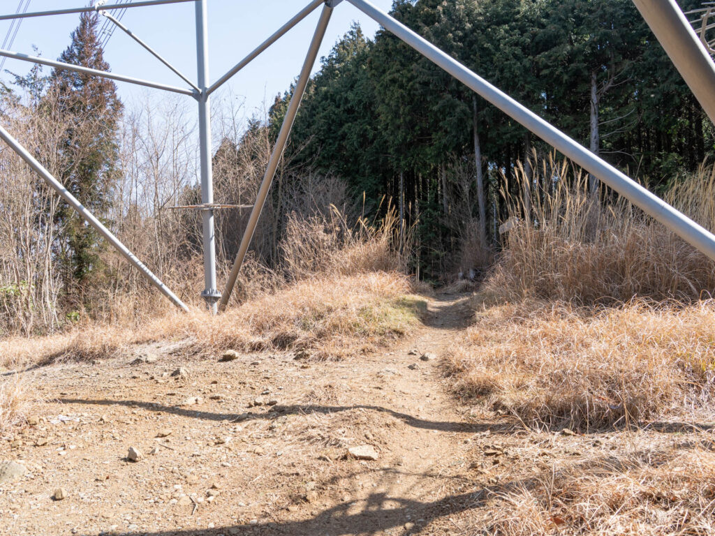 緩やかな山道を歩いていくと、大きな鉄塔の真下に出ます。道標があるほうへ進んで山頂を目指しましょう。