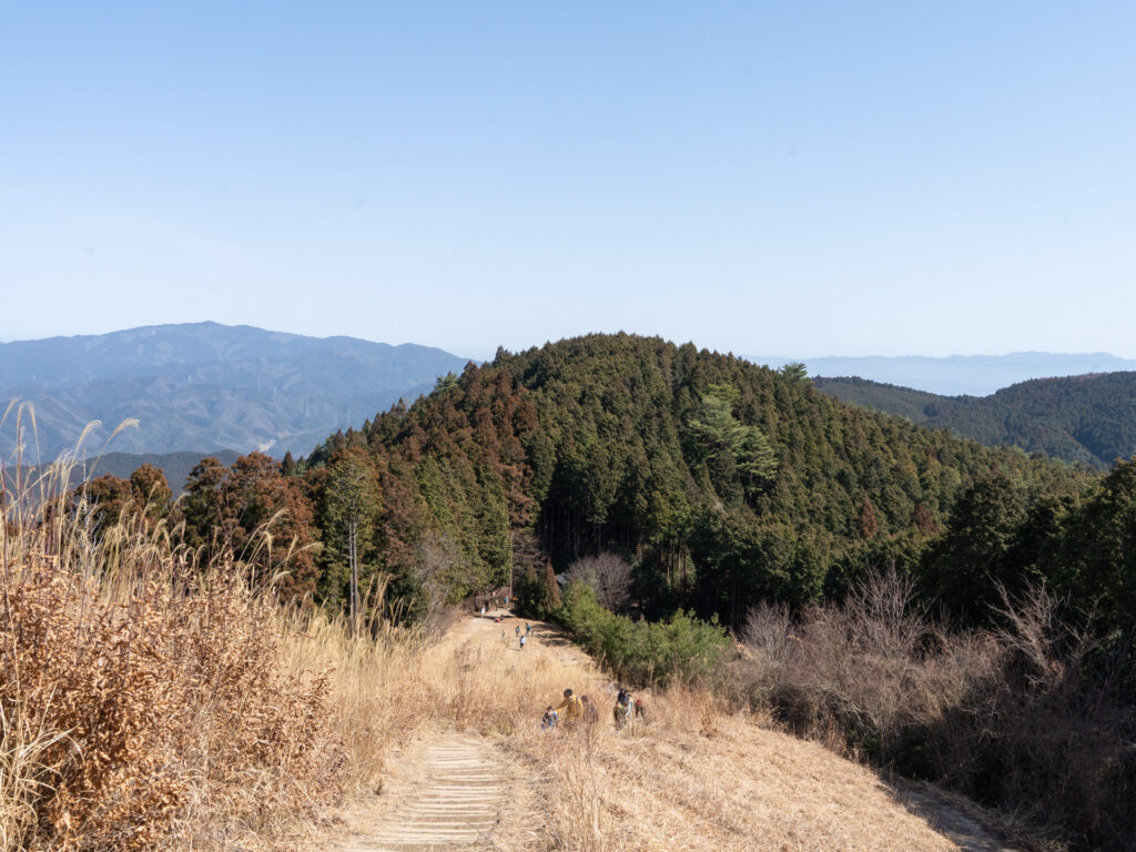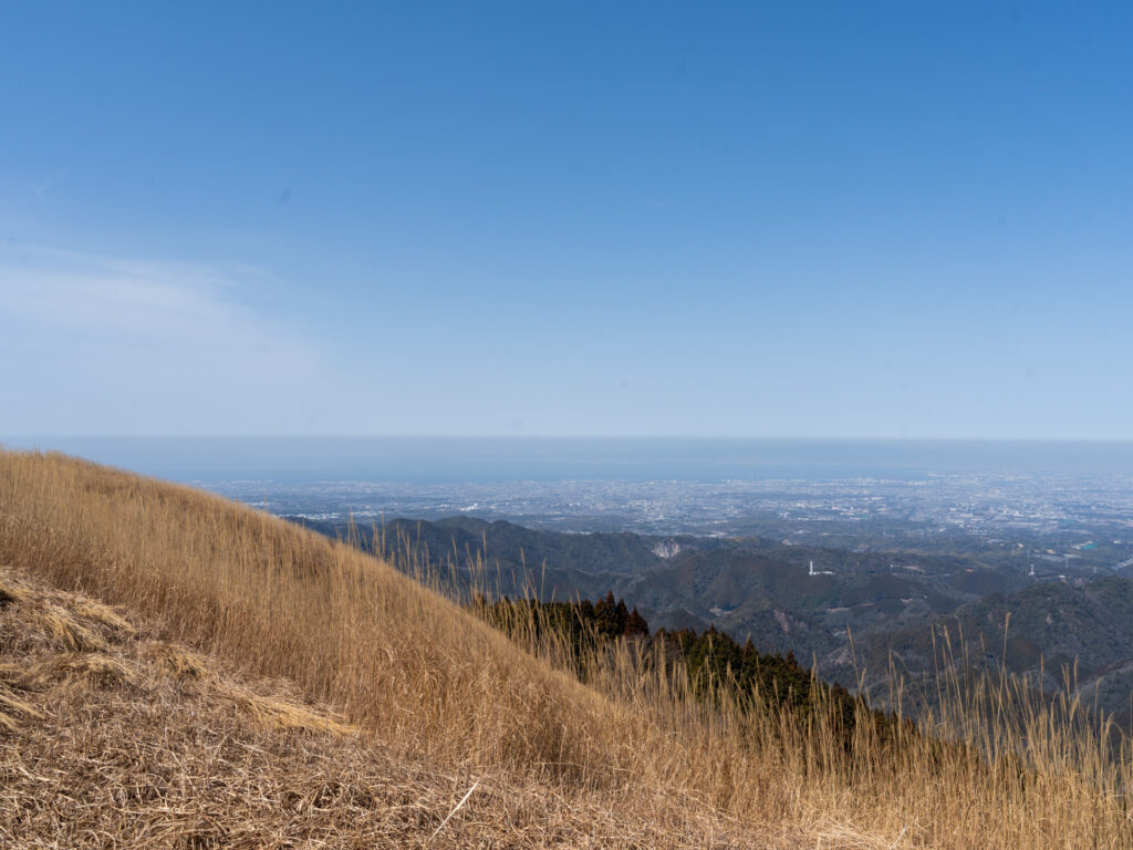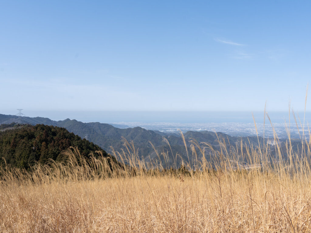 穏やかな日差しと青空、ススキのコントラストが美しい山頂周辺。遠くには周辺の山々が重なり合う様子が見られます。