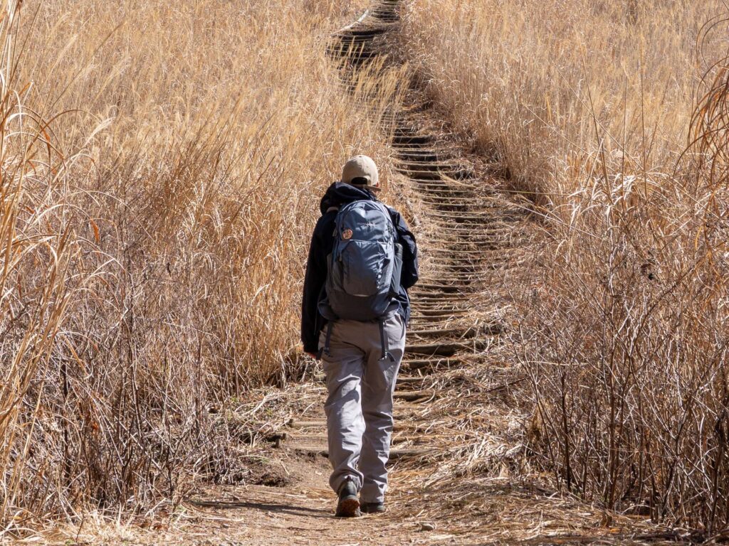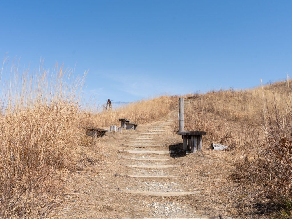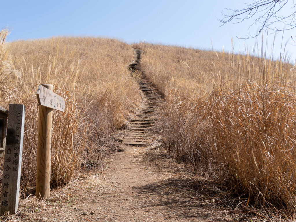 やや傾斜があるススキのエリア。登り最後のピークです。道沿いにベンチが設置されているので、少し足を休めてから山頂を目指しましょう。