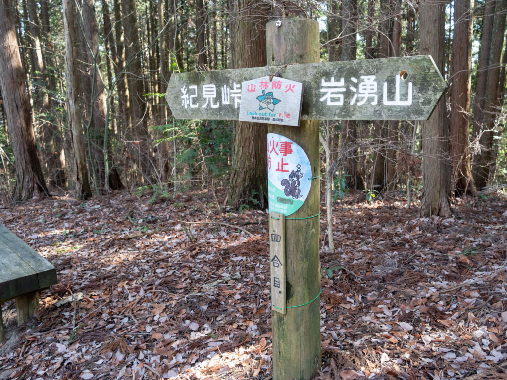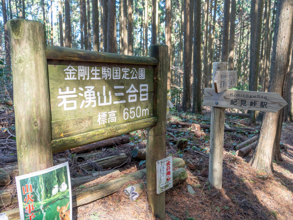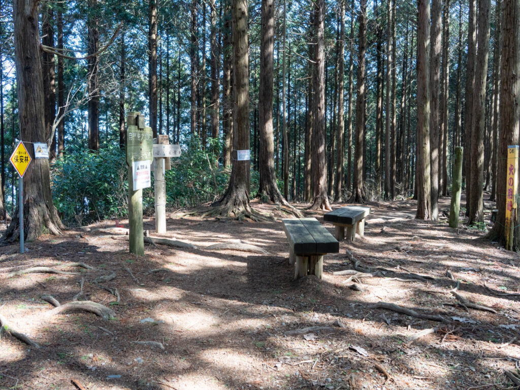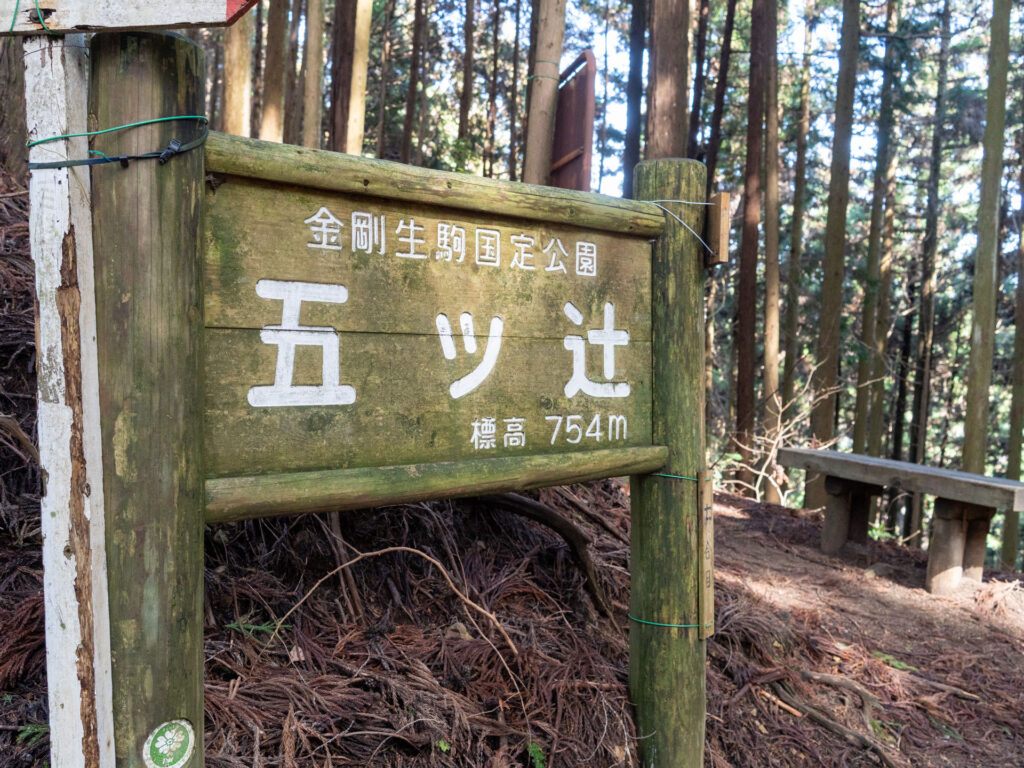 緩やかな起伏をいくつか過ぎると、岩湧山7合目の「五ツ辻」に到着しました。ベンチや案内板がある休憩スポットなので、ここで一度荷を下ろし、水分補給をしておきます。