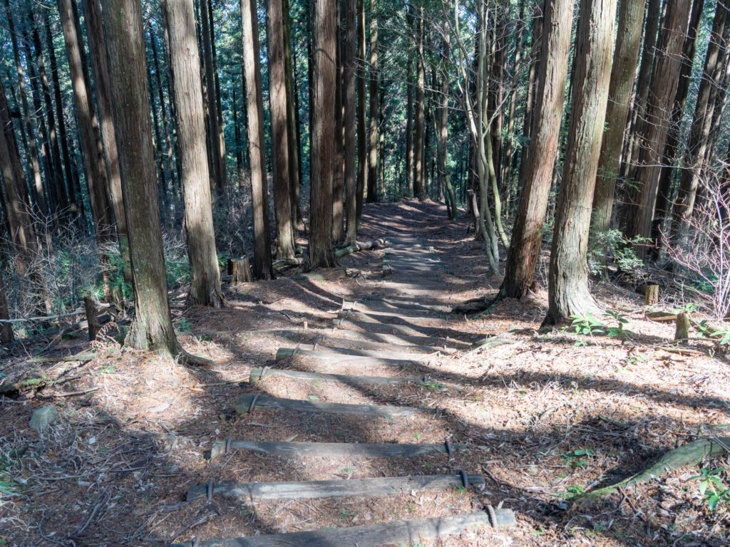 樹林帯が始まり、しばらく階段を登ります。真っすぐ伸びる木々に囲まれた道は、登山でしか味わえない醍醐味。自然を体感しながら進んでいきましょう。