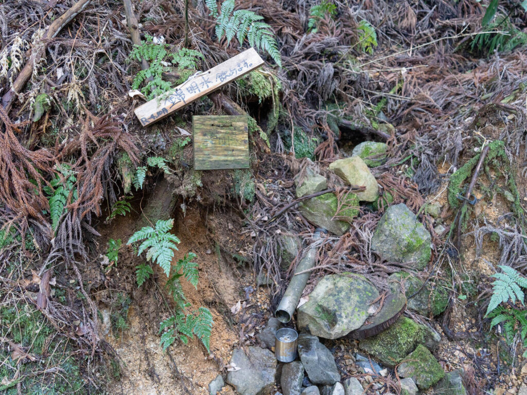 休憩を済ませ樹林帯を歩いていると、途中で水場を発見。「錦明水」と書かれたこの湧き水は、飲み水として利用できます。