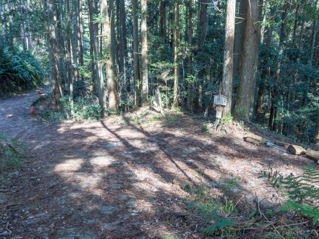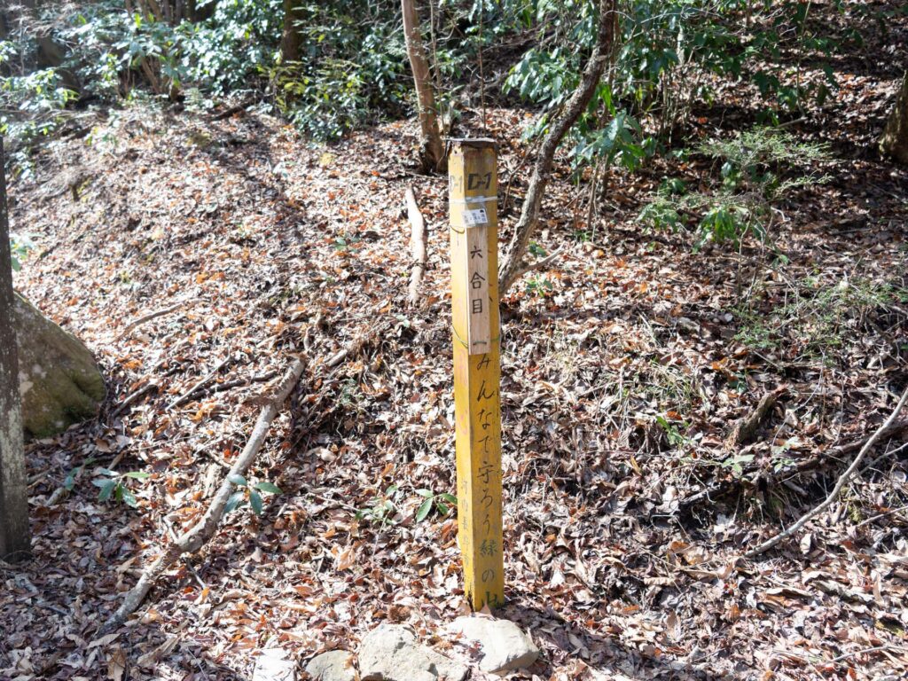 6合目に到着しました。この分岐は左奥の道へ進みます。右は和泉山脈の最高峰「南葛城山(みなみかつらぎさん・標高922m)」へ向かう登山道です。コースを間違えないよう注意してください。