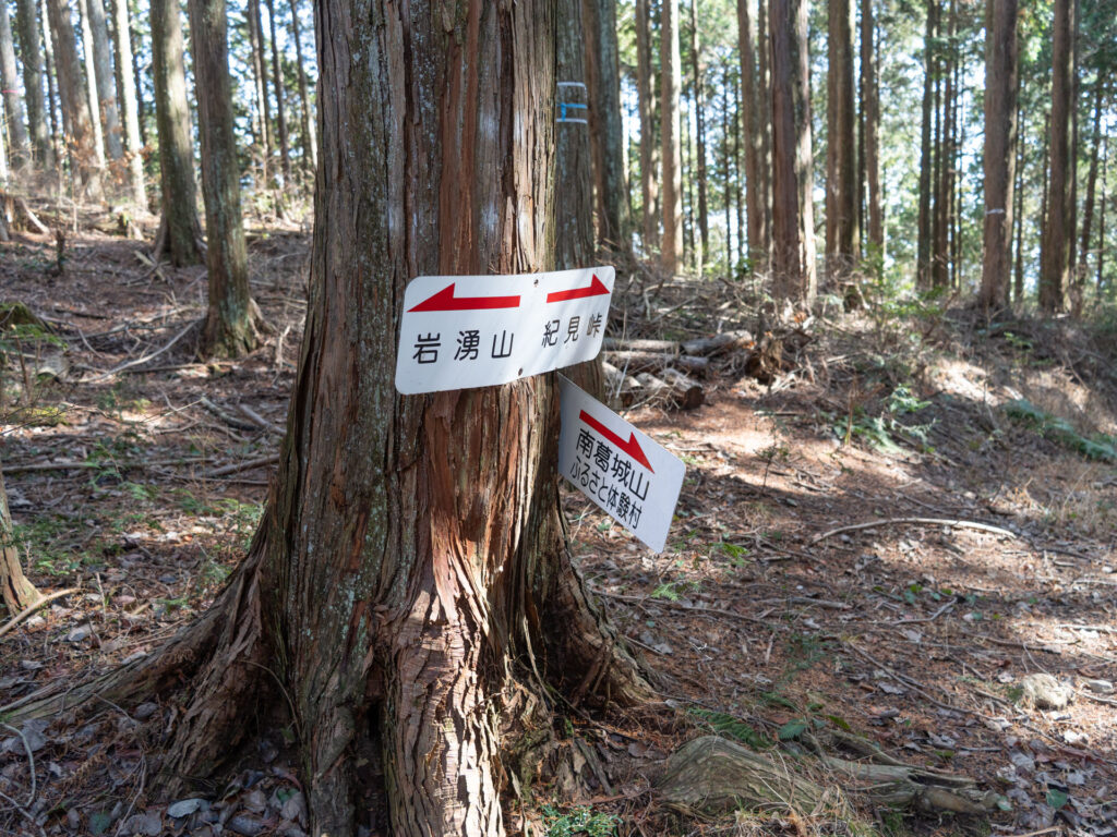 しばらく歩くと分岐点に到着。道標を確認して、紀見峠方面へ続く正面の道を進みましょう。