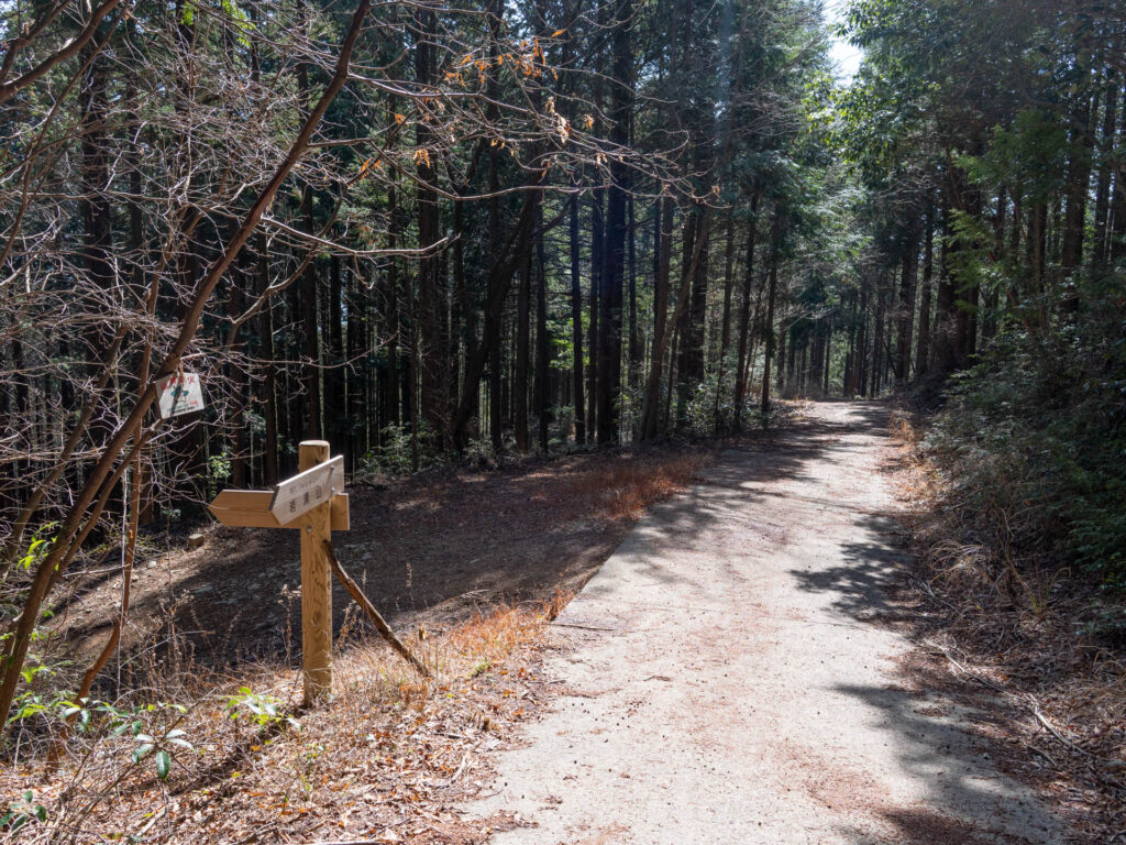 左手側の道標奥にある登山道へ入ります。舗装路の途中で見逃しやすいため、地図をよく確認しながら進みましょう。