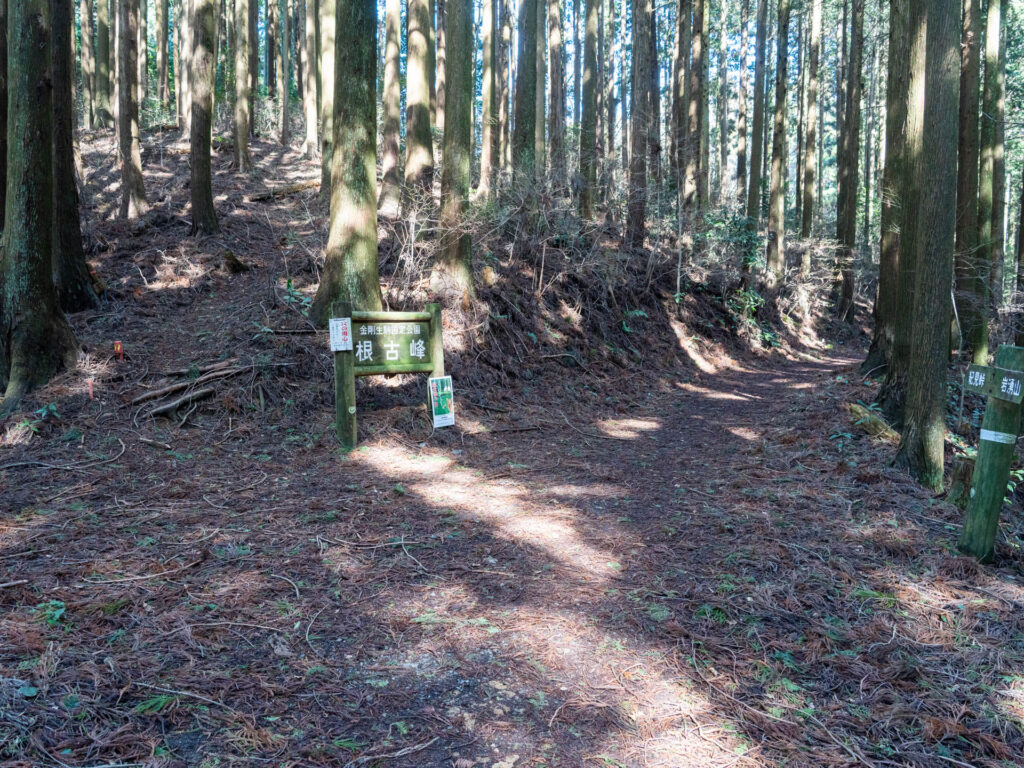 東峰はコースの分岐点で、左の道は岩湧山や河内長野市方面に続いています。今回は紀見峠駅へ向かうため、正面の道を進みましょう。根古峰に向かっていきます。