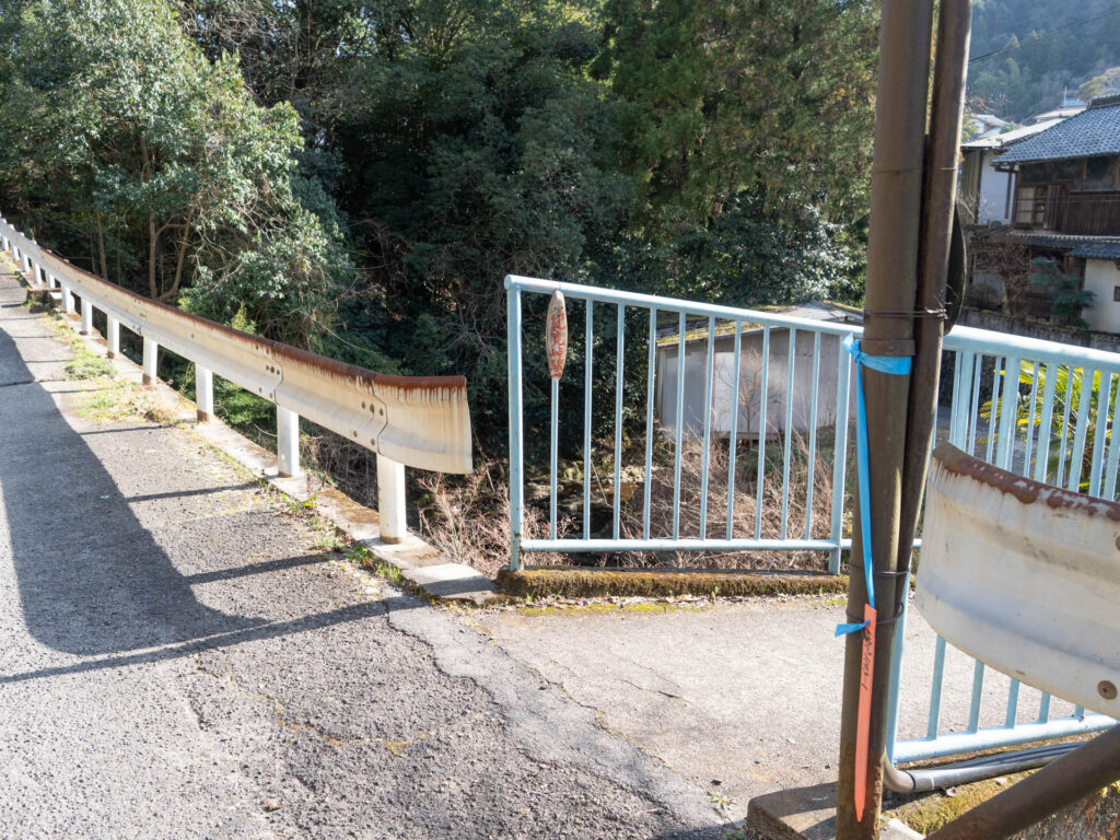線路沿いの舗装路を下っていき、右側にある青い柵に囲まれた小さな橋を渡ります。橋を越えたら左折しましょう。