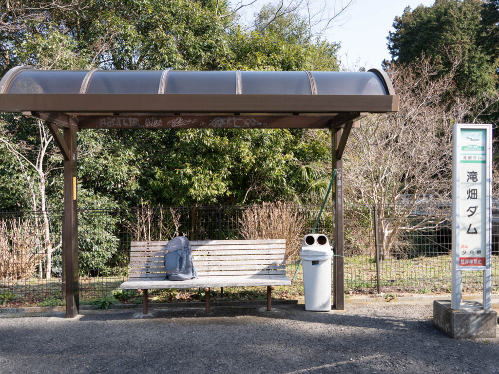 「滝畑ダムバス停」でバスを降り、登山口へ向かうところからスタート。バス停からゆるい坂道を5分ほど歩くと、休憩施設の「滝畑湖畔観光」へ辿り着くことができます。