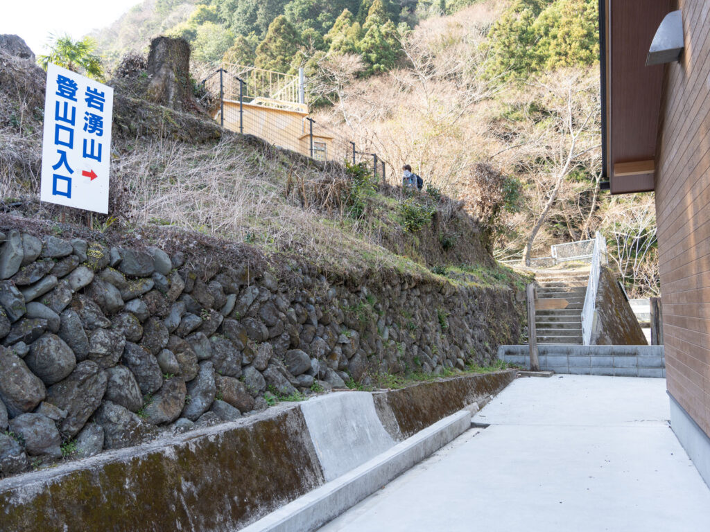 準備を済ませたら、いよいよ登山開始。有料駐車場と書かれた看板の奥、トイレ手前にある登山道へ足を踏み入れます。山頂までは4km、所要時間は約2時間です。