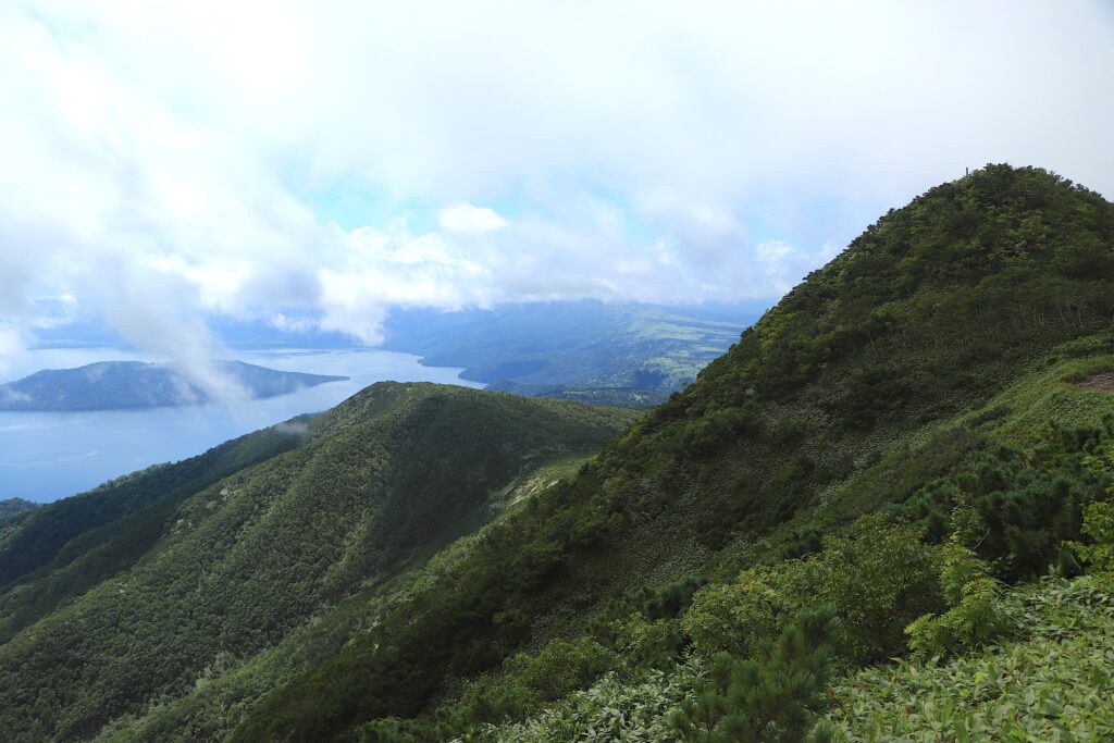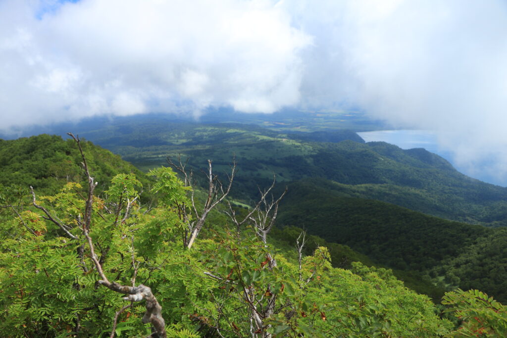 やがて傾斜は緩やかになり、歩きやすい尾根道へと変わります。足元は比較的整っており、景色を楽しみながら歩きやすい区間です。ふと振り返ると、なだらかな曲線を描く稜線の向こうに屈斜路湖がのぞき、標高を上げるごとに景色が変わっていくのを実感できます。