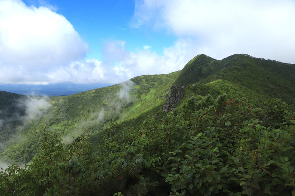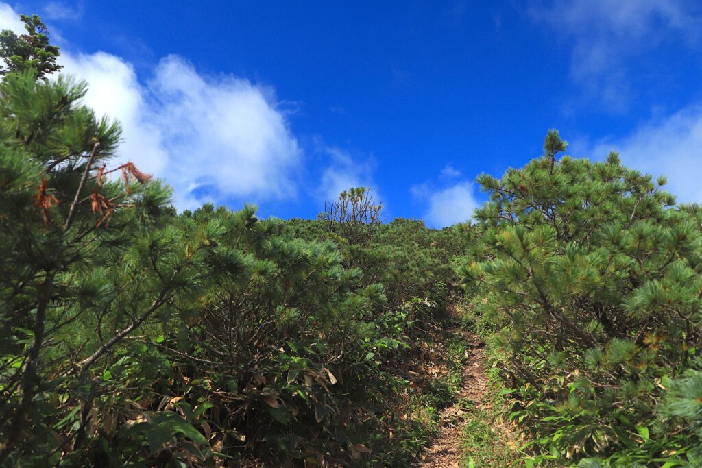 ハイマツ帯を抜ける登山道は風が通り抜ける心地よいルートです。晴れた日にはやわらかな風に包まれながら、どこまでも広がる景色の中を歩く時間が続き、下山まで飽きることがありません。