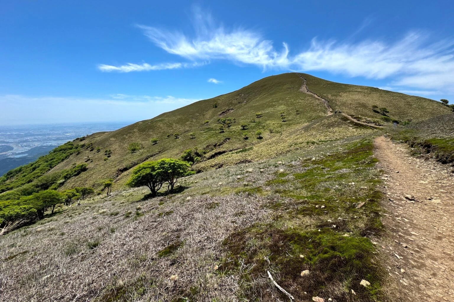 まっすぐに延びる道の頂点が竜ヶ岳の山頂で、山頂からは360度の遮るもののない大展望が広がっています。西側には伊勢の平野が広がり、その先には海が光っています。